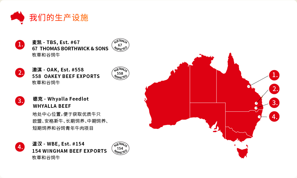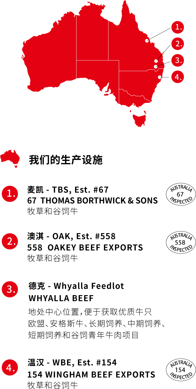 我們集團(tuán)的牛只源頭廣泛,均來(lái)自澳大利亞?wèn)|部各地優(yōu)質(zhì)的牧牛場(chǎng),以滿(mǎn)足每種產(chǎn)品規(guī)格的精選要求,包括安格斯牛、墨瑞灰牛、赫里福德牛以及其它用于制作高級(jí)谷飼產(chǎn)品的英國(guó)品種。