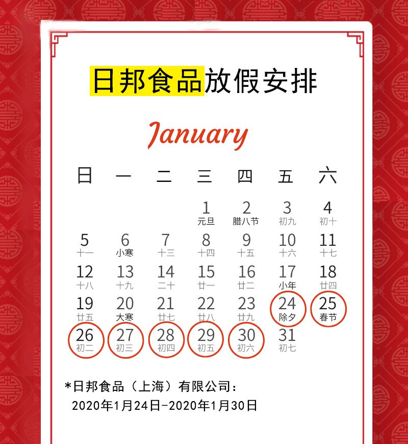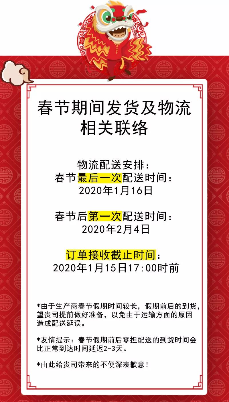 非常感謝貴司長期以來的支持與厚愛! 隨著元旦的來臨,2020年度春節(jié)假期也即將來臨,為便于貴司提前備貨,現(xiàn)將我司在此期間的發(fā)貨及物流相關安排提前報備給貴司。 如有問題請聯(lián)絡。